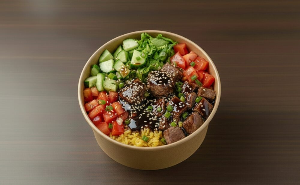 Beef Poke salad made with cooked beef, rice, fresh vegetables (lettuce, cherry tomatoes, cucumber, green onion), and dressed with olive oil sauce. Finished with butter, olive oil, sesame seeds, and curry seasoning (427 gr.)